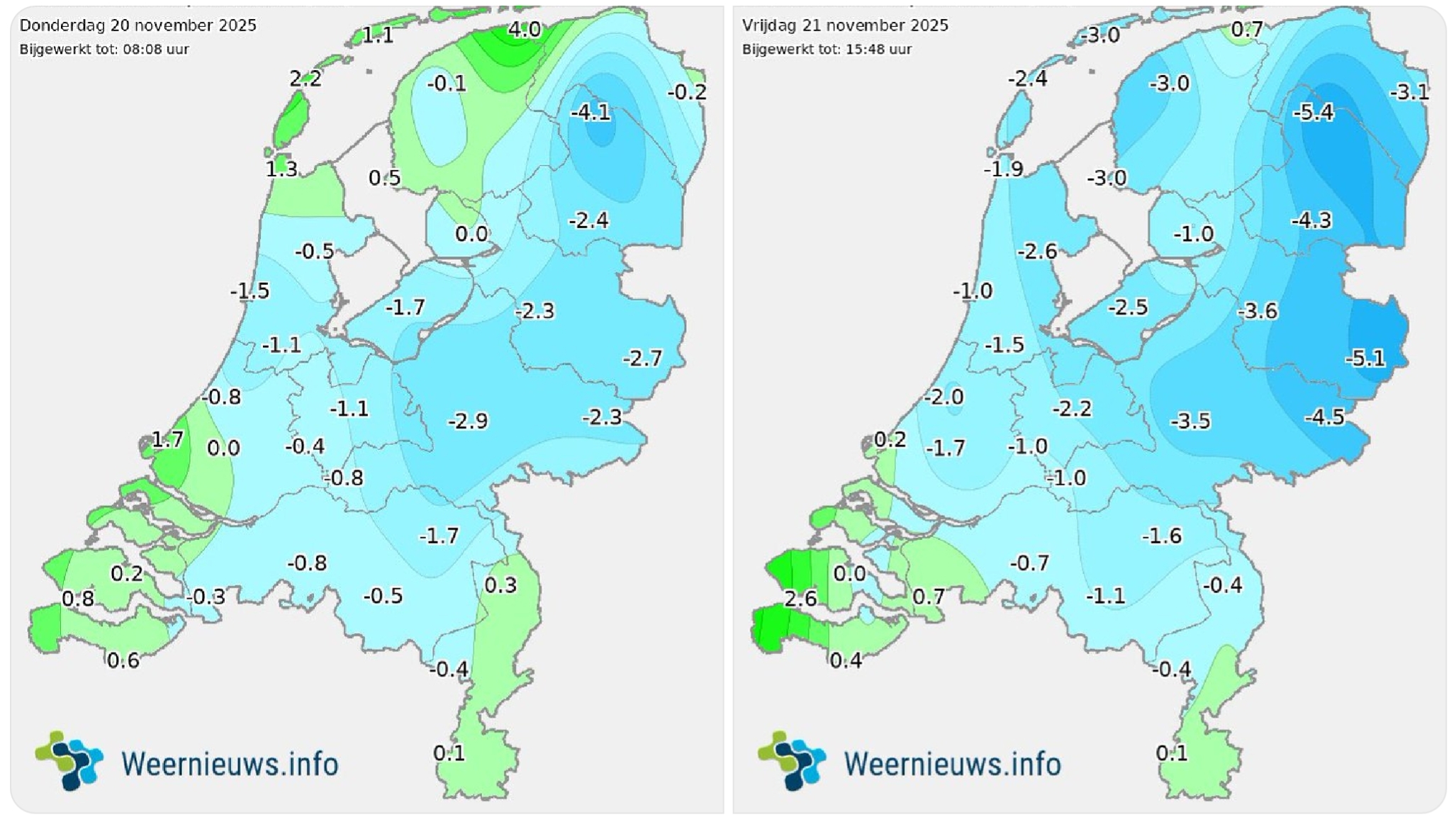 We bevinden ons deze week in een koude luchtsoort waarbij het regelmatig tot vorst in de nacht komt. Zondag volgt mogelijk wat sneeuw, maar daarna lijkt het weer wat zachter te worden.