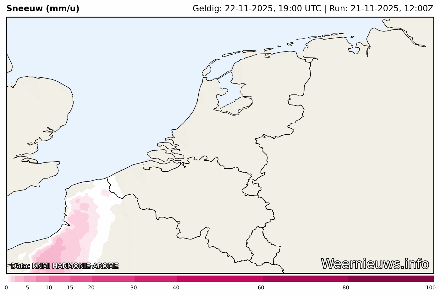 In de nacht naar zondag trekt een neerslagzone van west naar oost over het land en lijkt het overal tot sneeuwval te komen. Zondagochtend kan Nederland dan ook ontwaken in een witte wereld. Grote hoeveelheden worden niet verwacht, maar een sneeuwdekje van 1 à 2 centimeter lijkt reëel. Mogelijk is het in de hogere gebieden net wat meer. Lang zal de sneeuw trouwens niet blijven liggen, want in de loop van de ochtend ligt de temperatuur overal weer ruim boven nul.
