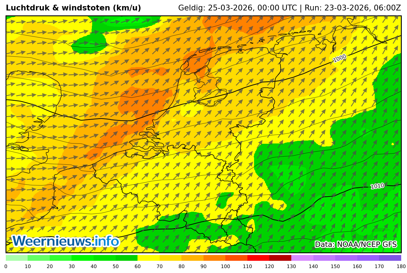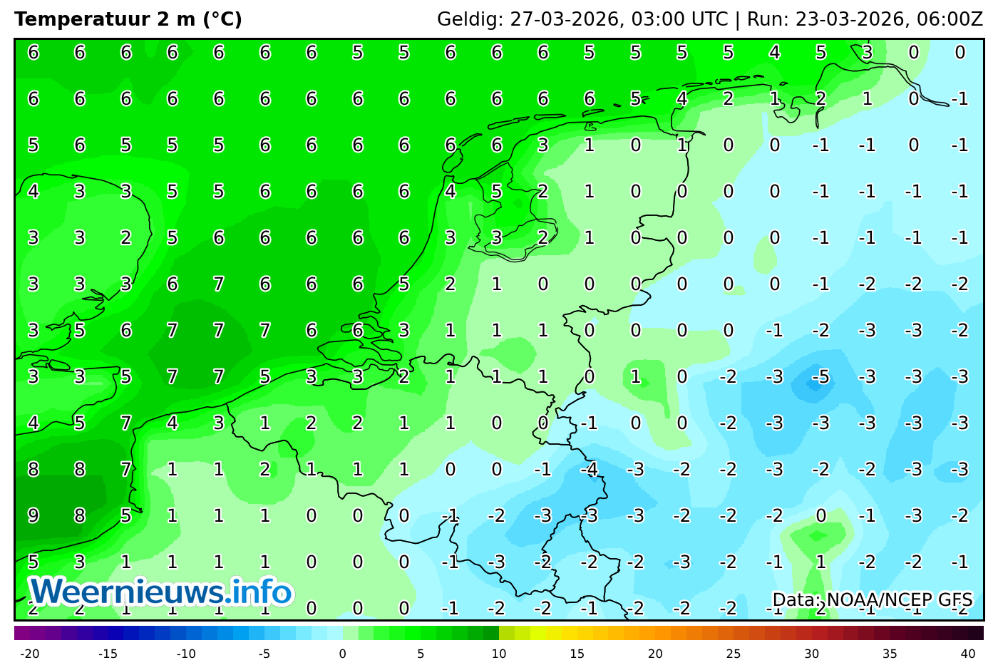 Vanaf het midden van de week draait de stroming naar het westen tot noordwesten en wordt beduidend koudere lucht aangevoerd. De maxima komen nog maar uit tussen 5 en 8 graden en daarmee liggen de temperaturen ruim onder het niveau dat je eind maart mag verwachten. In combinatie met een matige wind voelt het bovendien guur en schraal aan.