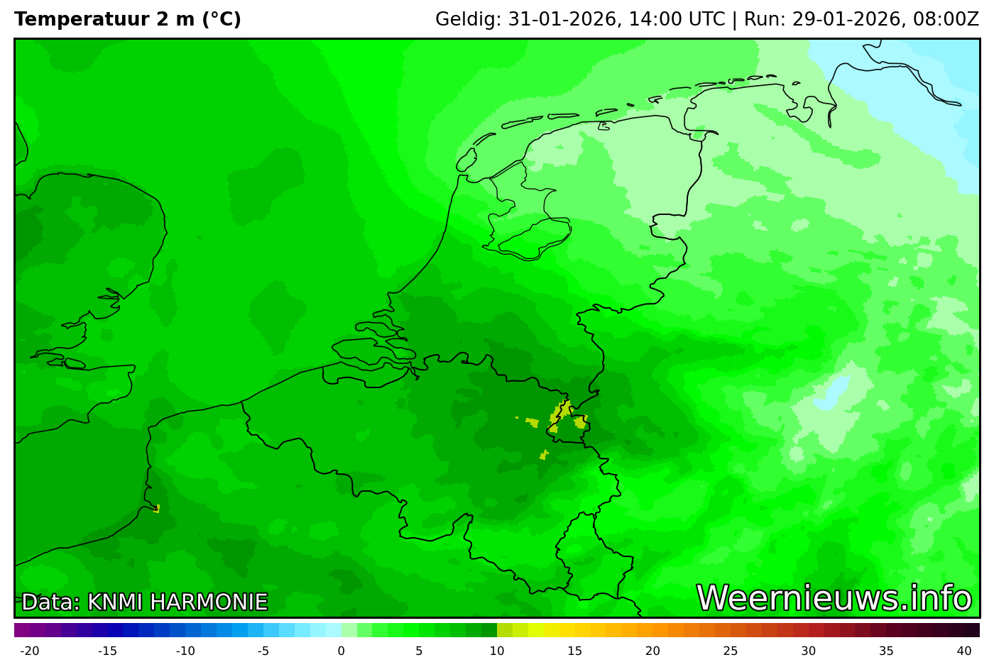 Grote verschillen in temperatuur zaterdagmiddag volgens het Harmonie model.